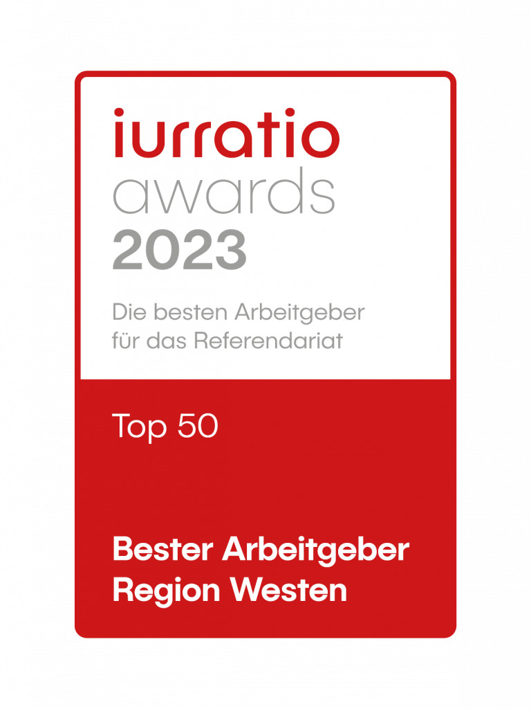 Es freut uns, dass dies nicht unbeobachtet blieb. Die Kanzlei wurde daher im Rahmen der Iurratio Awards als Top 50 Arbeitgeber in der Region Westen ausgezeichnet.